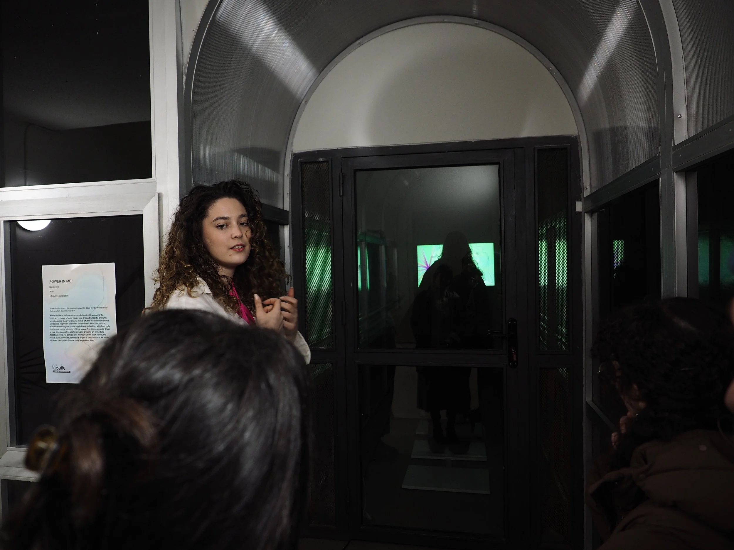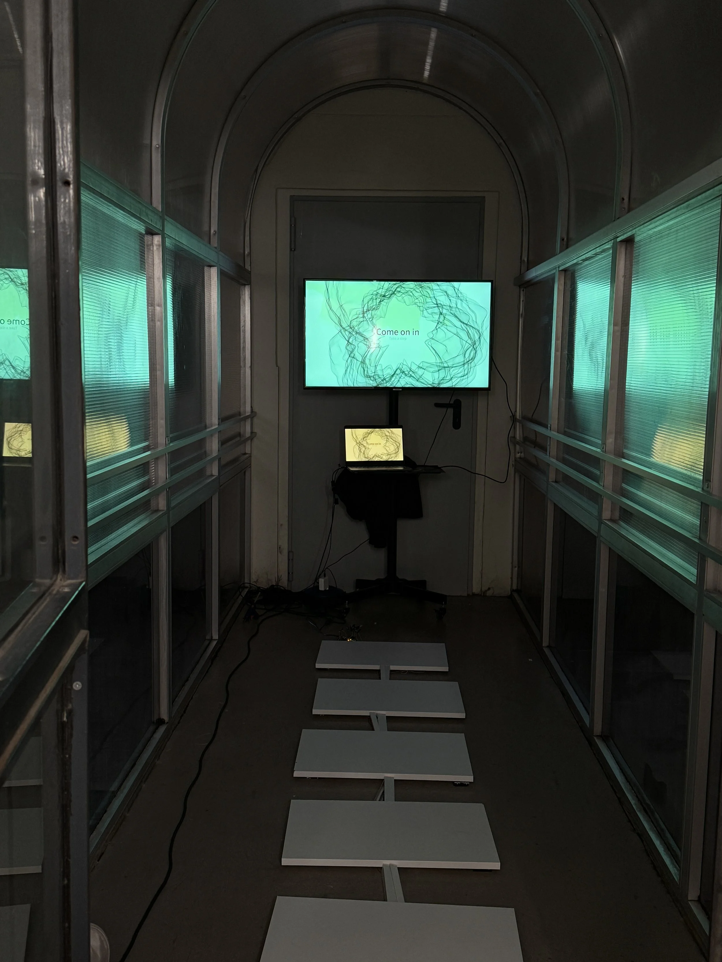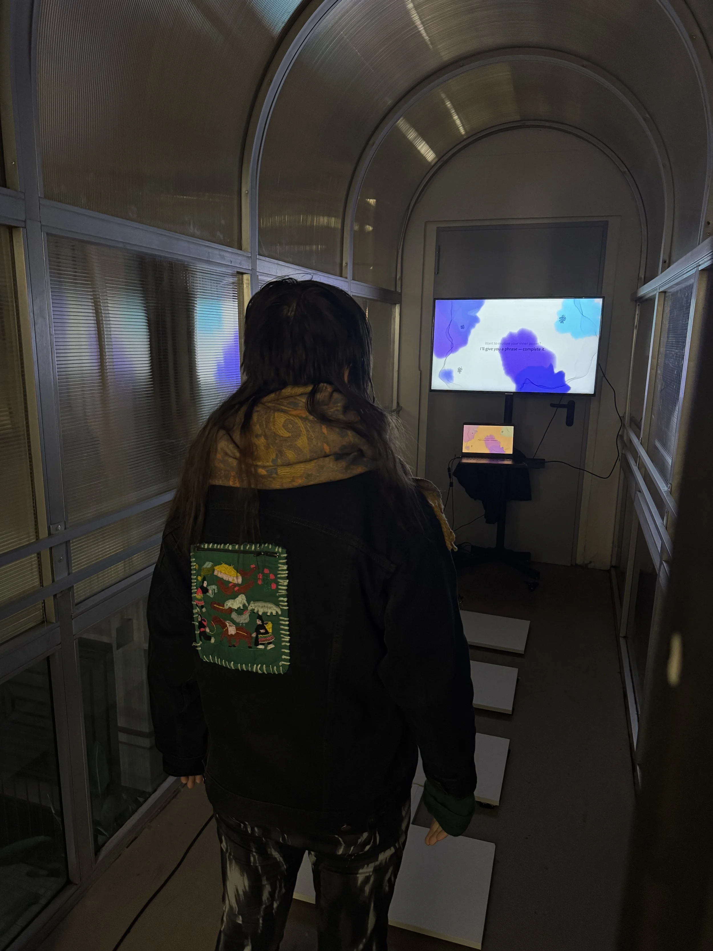 Participants navigate a custom pathway embedded with load cells that measure the intensity of their steps. When a participant entered the venue the installation starts to lead them. It basically asks the reasons them feel powerful and take a step. Each step they are taking they need to find another reason why they are powerful. While thinking how powerful they are, they truly start to feel powerful and their steps gets firmer and more strong. That creates biometric data where I collected from steps. This biometric data drives a real-time generative digital artwork, creating an immediate feedback loop. As participants move on the way with mentally affirming their power, the visual output evolves, serving as physical proof that the awareness of one’s own power is what truly empowers them.